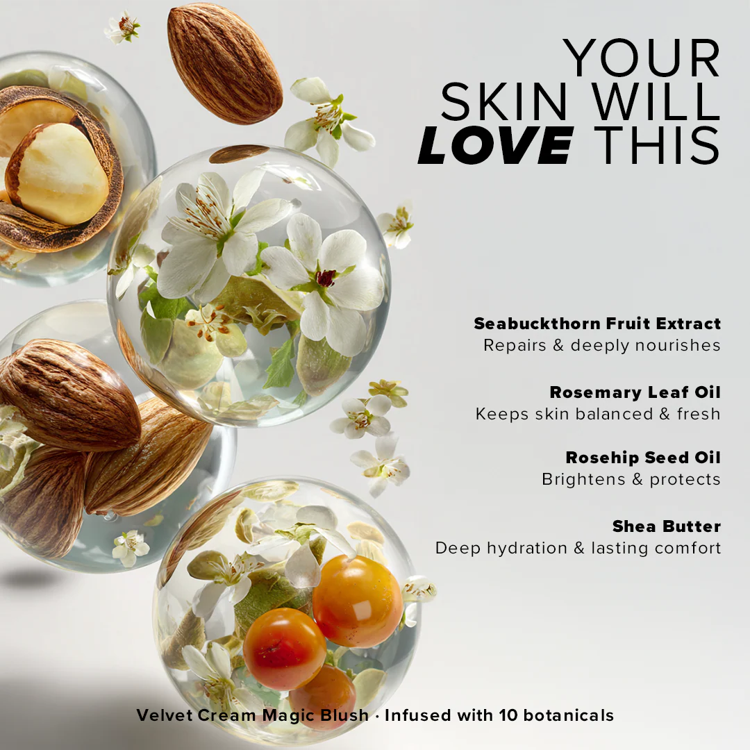 Velvet Cream Magic Blush is a skincare-powered cream blush infused with 10 nourishing botanicals — including Seabuckthorn Fruit Extract, Rosemary Leaf Oil, Rosehip Seed Oil, and Grape Seed Oil for deep nourishment, balance, renewal, and lightweight hydration. The formula hydrates, softens, and comforts the skin while delivering a natural, dewy finish that lasts through Indian heat and humidity.